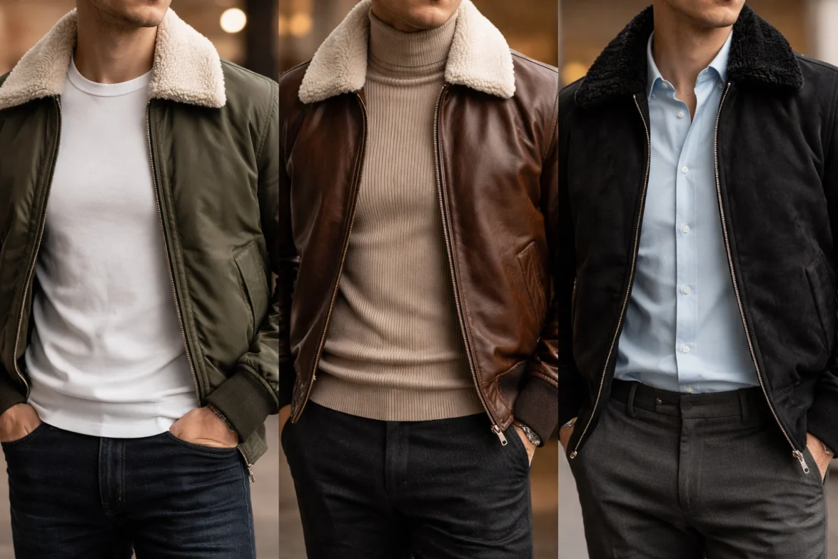 | Blouson aviateur + chemise + pantalon sobre | Élégant avec caractère | Moyen | Style smart casual |